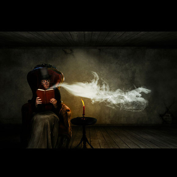Zdjęcie opisane frazami: bajeczny świat, foto manipulacje, fotomontaż, full color, mężczyzna, portret, przestrzeń.